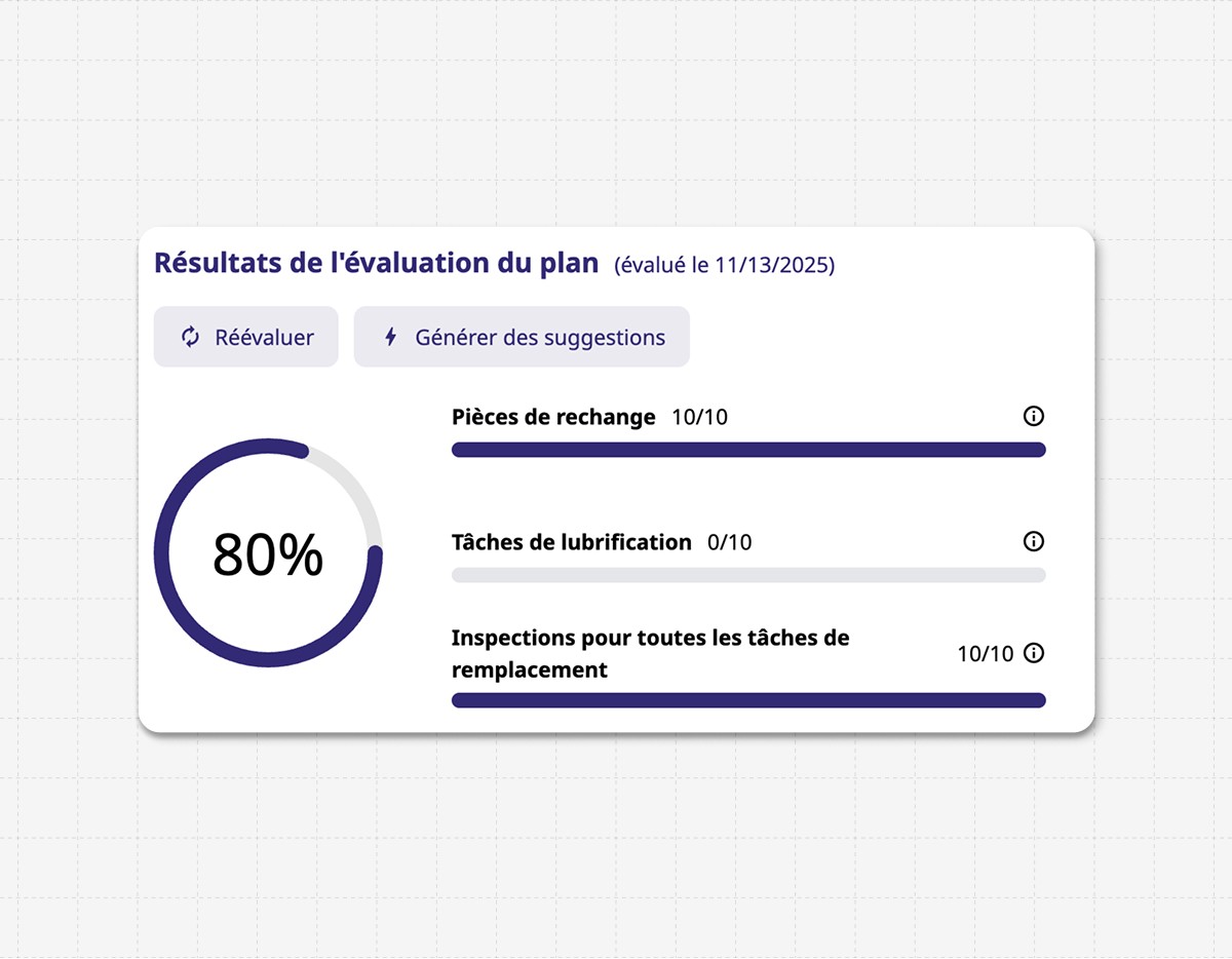 Générez instantanément des plans de maintenance complets en fonction du type de vos actifs, de leur utilisation et des normes industrielles.